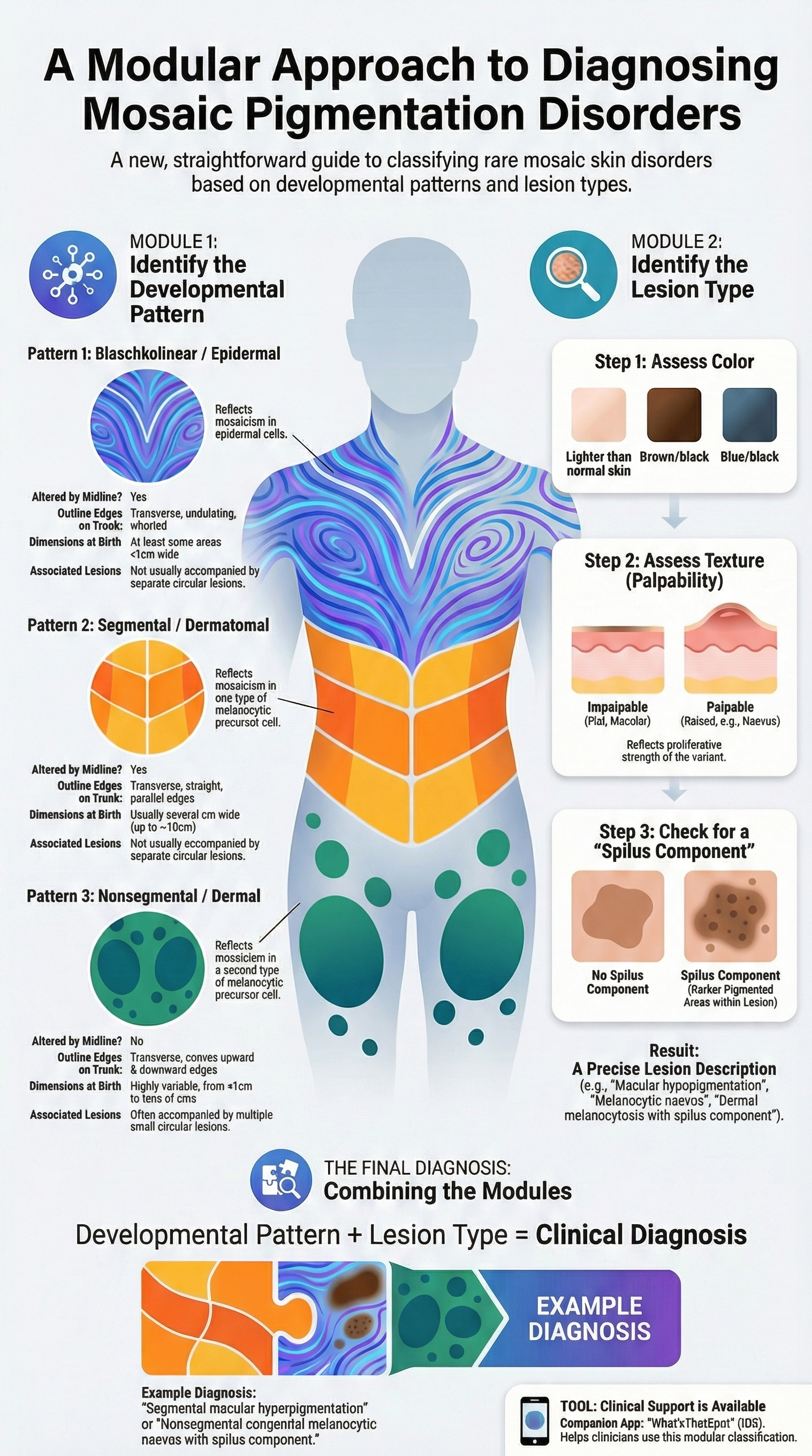 Diagnosis is achieved by combining the Developmental Pattern with the Lesion Type (color, palpability, and the presence of a "spilus component").. This unified framework includes everything from macular hypopigmentation to palpable melanocytic nevi, suggesting that the "thickness" of a lesion reflects the proliferative strength of the genetic variant rather than a different disease process.